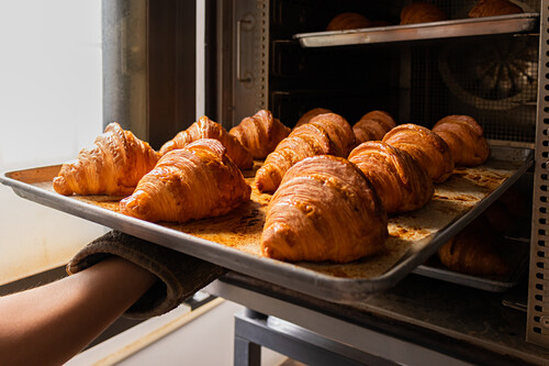 Delicious freshly baked croissants placed on counter tray being taken out of oven by hand of anonymous person in bakery at daylight